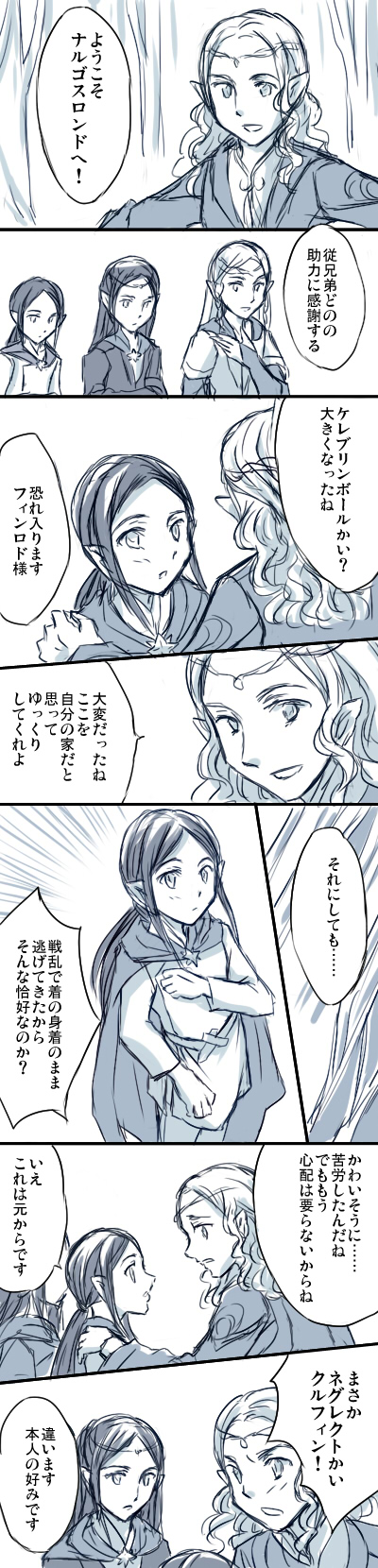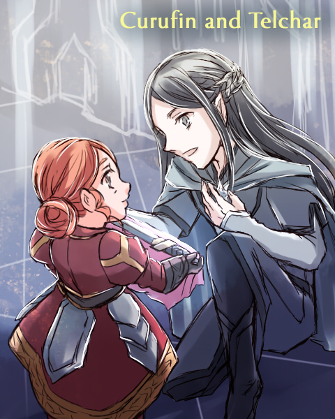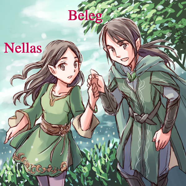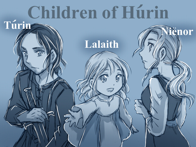 トゥーリンとラライスとニエノール。 『The Children of Hurin』って、要はこの三人の事ですよねっていう。そして三人とも子孫を残さず、ハドル家の直系はそこで絶えるのです(トゥオルの方からエアレンディルへと続いていきますが)。 トゥーリンとニエノール(ニーニエル)のカップル、結構好きなんですよー。たとえグラウルングによって狂わされた運命であっても、二人が出会い愛し合った気持ちは本当だと思いたいです。 ラライスとニエノールはラライスの方が姉なのに享年の違いから外見年齢差がついている所が好きです。