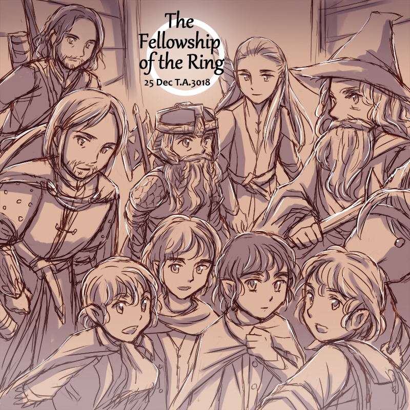 The Fellowship of the Ring メリークリスマスです! 指輪物語的に言って12月25日と言えば、旅の仲間が裂け谷を発った日です。この世界にクリスマスの習慣はないとはいえ、クリスマスのその日に危険な旅路に向かうなんて何というハードな……。でもその間にも心和むような交流があった事を思うと微笑ましいのです。 やはり自分の中では、指輪物語といえばこの九人+子馬のビルの一行が基本です!